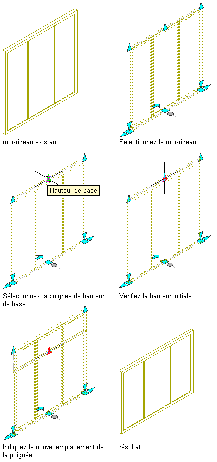 Cette procédure permet de modifier la hauteur de base d'un mur-rideau à l'aide de poignées.