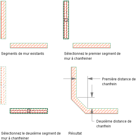 | spécifier la longueur par défaut et les valeurs des angles (si vous choisissez l'option angle) | tapez a (Angle). Entrez la distance entre l'extrémité et le point du mur où doit commencer le chanfrein. Spécifiez l'angle du chanfrein. |