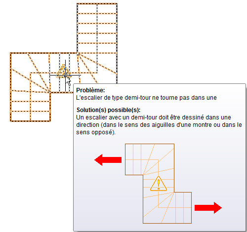 Lorsqu'Jeu d’outils AutoCAD Architecture 2027 détecte un problème de tracé d'un objet d'escalier, il affiche une icône de conseil de correction sur l'escalier dans le dessin.