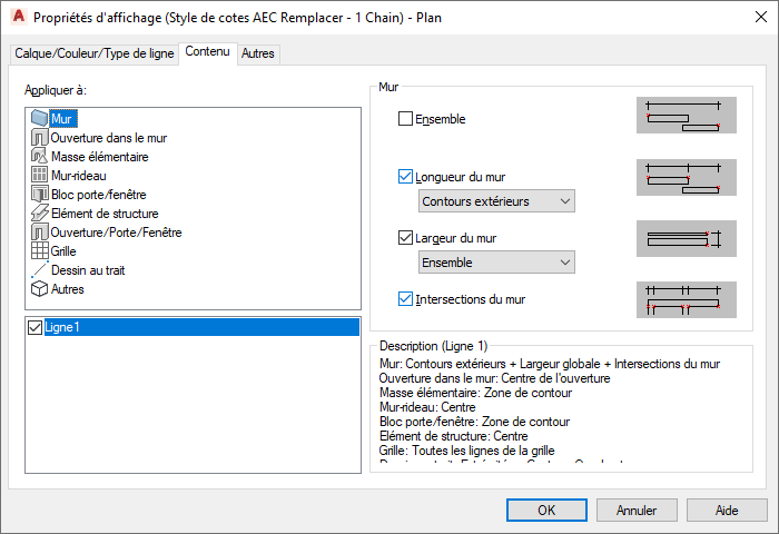 Sous la liste Appliquer à sont répertoriées les lignes disponibles dans ce style de cote AEC.