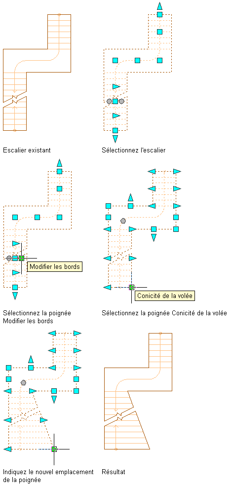 Utilisation des poignées pour modifier la conicité d'une volée d'escalier