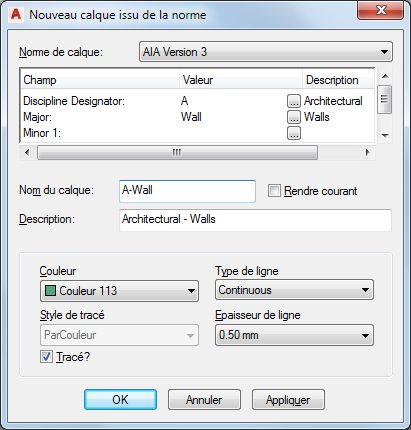 Cette procédure permet de créer un calque conforme à la norme de calque sélectionnée pour le dessin. Les normes de calques définissent l'attribution des noms des nouveaux calques en fonction de la structure définie dans la norme. Jeu d’outils AutoCAD Architecture 2027 crée des calques selon les besoins, en fonction de la norme de calque en cours. Par exemple, lorsque vous ajoutez un mur dans un dessin, le logiciel crée les calques de mur nécessaires, s'ils n'existent pas encore.