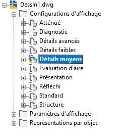 Le volet gauche du Gestionnaire d'affichage classe les informations d'affichage concernant vos dessins dans une arborescence. Vous pouvez ajouter, supprimer, renommer, copier et envoyer des composants du système d'affichage de la vue arborescente. Lorsque vous sélectionnez des éléments dans l'arborescence, le volet droit est mis à jour en conséquence.