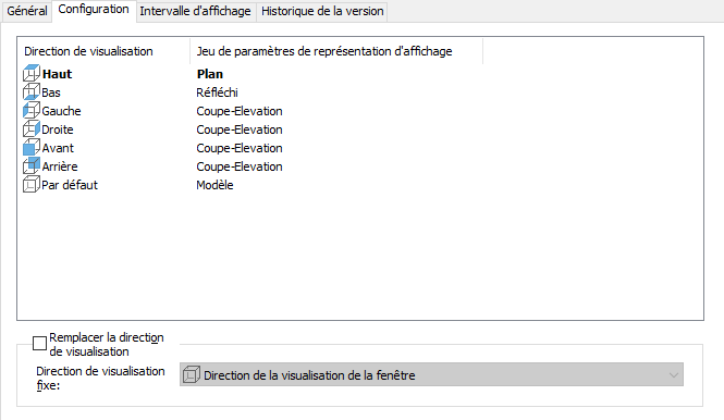 Dans l'exemple suivant, le paramètre d'affichage Modèle est appliqué à la direction de visualisation par défaut. Le volet droit montre que le paramètre d'affichage Coupe_Elev est appliqué aux directions avant, arrière, gauche et droite. Le paramètre d'affichage Plan est appliqué à la direction de visualisation Haut. Dans le volet droit, les icônes correspondent aux six directions orthogonales et à la direction par défaut.