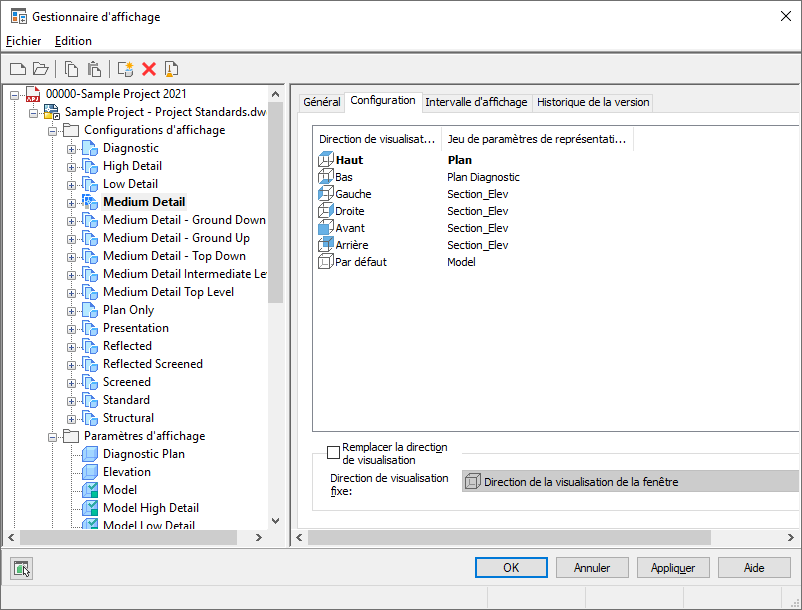 Le Gestionnaire d'affichage est l'emplacement central d'affichage des informations système du dessin dans Jeu d’outils AutoCAD Architecture 2027. Il permet de créer et de modifier les configurations, les paramètres et les représentations d'affichage. Vous pouvez également affecter une configuration d'affichage à une fenêtre et visualiser l'affichage des objets dans différentes représentations. Vous pouvez redimensionner la fenêtre du Gestionnaire d'affichage ainsi que les volets droit et gauche afin d'afficher les informations d'affichage.