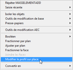• Dans le menu contextuel de l'objet, choisissez Modifier le profil sur place. Si un objet possède plusieurs composants basés sur des profils, sélectionnez d'abord le sous-menu adéquat, par exemple, Profils de coupe Modifier sur place.