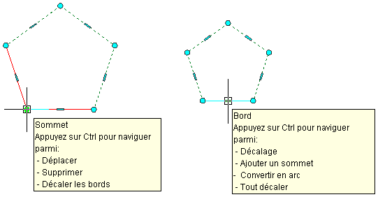 • Avec les poignées : sélectionnez la poignée de sommet à décaler avec ses bords associés. Ensuite, appuyez deux fois sur la touche CTRL et faites glisser le sommet vers le nouvel emplacement.