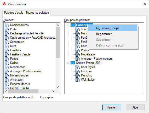 Conseil : La boîte de dialogue Personnaliser peut être très utile pour ajouter des palettes aux groupes de palettes d'outils.