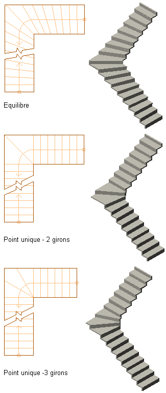 Vous avez le choix entre trois types de balancements offrant chacun un degré de contrôle différent pour les escaliers à 1/2 tour et 1/4 tour : Equilibré, A point unique et Manuel.