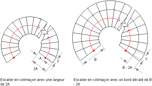 Pour créer un escalier en colimaçon qui présente une profondeur de giron donnée (T) s'appliquant à une distance donnée du bord intérieur, construisez d'abord un escalier avec une largeur égale à deux fois la distance requise (A). Utilisez l'option Personnaliser le bord, décalez ensuite le bord externe pour atteindre la largeur totale voulue (B). La distance de décalage est égale à B - 2A.