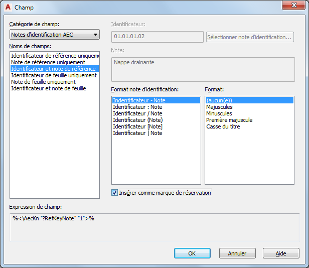 3. Dans la boîte de dialogue Champ, assurez-vous d'avoir choisi Notes d'identification AEC dans la liste déroulante Catégorie de champ, puis sélectionnez un format de note d'identification dans la liste Noms de champs. Si l'une des options d'identificateur et de note est sélectionnée, vous pouvez choisir un élément dans la liste Format note d'identification. Vous pouvez également changer, si besoin est, le paramètre de la liste Format.