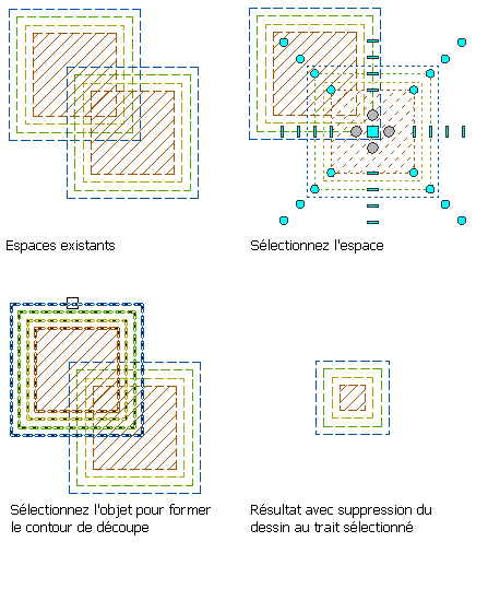 Lorsque vous retranchez un espace à un autre, le contour de base de l'espace source est soustrait de tous les contours du premier espace. Les autres contours de l'espace source sont juste supprimés sans qu'il y ait d'interaction avec le premier espace. Selon que les décalages du premier espace sont définis manuellement ou par le style, les contours autour du trou sont soit recalculés en fonction des valeurs de décalage du style, soit coupés au niveau de l'intersection.