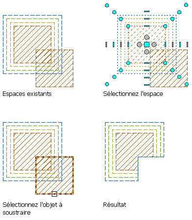 Cette procédure permet de soustraire des espaces 3D extrudés les uns des autres afin de créer un trou dans un espace.