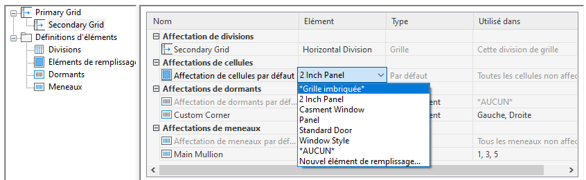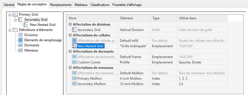 Cette procédure permet de créer une grille imbriquée, c'est-à-dire une grille à l'intérieur d'une autre grille. Chaque grille imbriquée est dotée de ses propres règles de division, affectations de cellule, dormants et meneaux. Par défaut, le dormant est désactivé pour les grilles imbriquées.