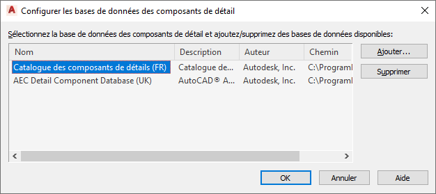 - Dans la page de l'onglet Contenu AEC, cliquez sur le bouton Ajouter/Supprimer correspondant aux bases de données des composants de détail.