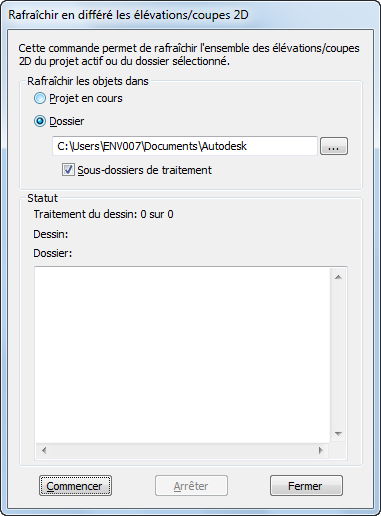 - Choisissez si vous souhaitez mettre à jour les coupes et élévations 2D du projet actif, ou les coupes et élévations 2D d'un dossier spécifique uniquement.