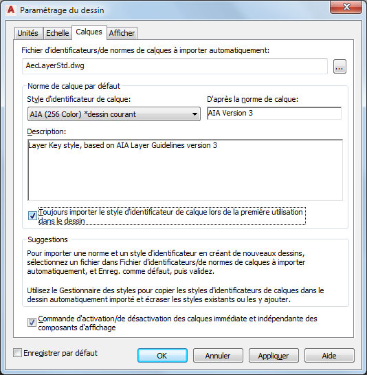 | enregistrer les paramètres du calque comme valeurs par défaut pour les nouveaux dessins commencés sans gabarit ou à partir d'un gabarit exempt de données de paramétrage | Sélectionnez l'option Enregistrer par défaut, puis cliquez sur OK. Les paramètres sur les onglets Unités et Echelle sont également enregistrés comme valeurs par défaut. |