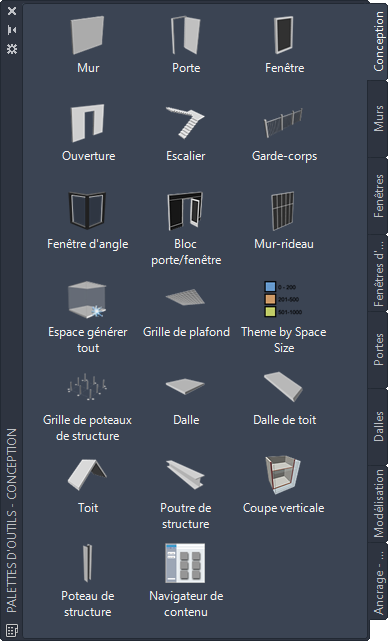 Les outils Jeu d’outils AutoCAD Architecture 2027 sont regroupés dans trois catégories.