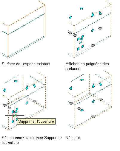 - Si vous avez sélectionné un espace 3D extrudé, cliquez sur la poignée de modification des surfaces. Toutes les poignées d'ouverture de surface de l'espace s'affichent.