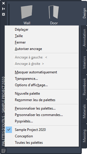 Pour ouvrir le jeu de palettes d'outils, cliquez sur l'onglet Débutgroupe de fonctions Constructionliste déroulante OutilsOutils de conception.
