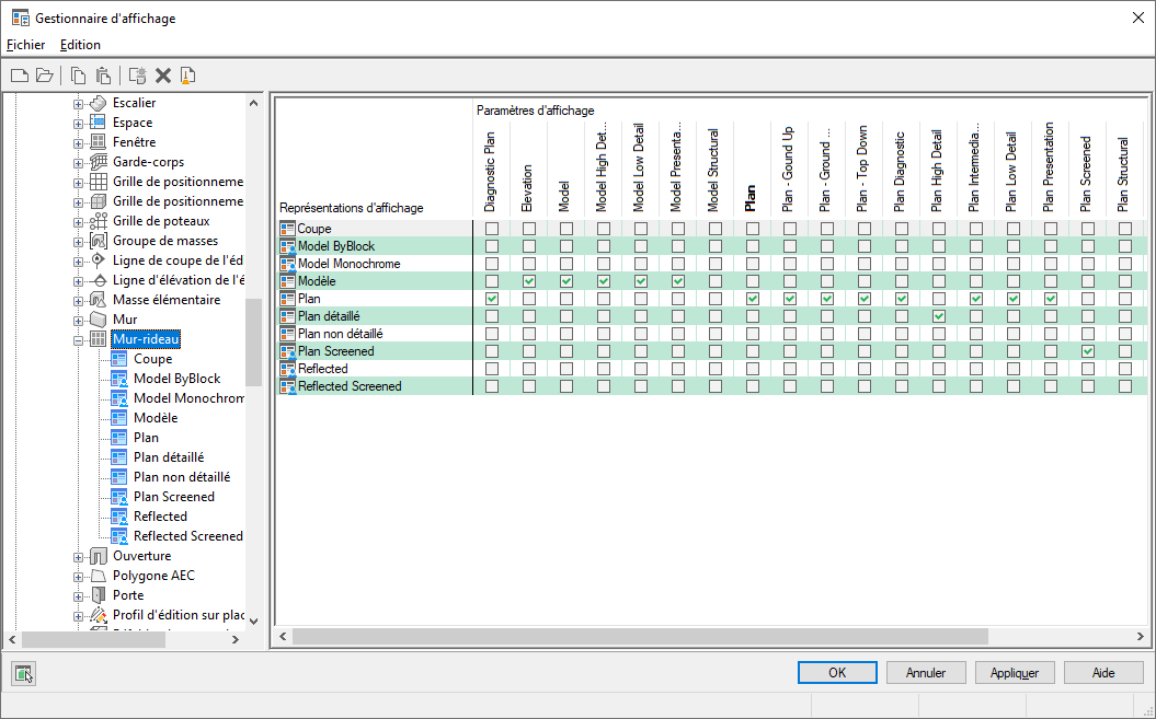 Dans le volet droit de la fenêtre, les représentations d'affichage qui existent déjà pour l'objet sélectionné sont répertoriées sur la gauche ; les paramètres d'affichage sont quant à eux répertoriés dans les colonnes de droite. Une coche placée sous un paramètre d'affichages indique que la représentation d'affichage est utilisée dans ce paramètre d'affichage. Une même représentation peut être utilisée dans plusieurs paramètres d'affichage.
