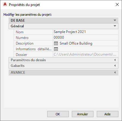 Remarque : Sous Paramètres du dessin, vous pouvez configurer le projet de sorte que le numéro de projet soit ajouté sous forme de préfixe à chaque dessin de projet généré dans ce projet. Si vous modifiez le numéro du projet au cours du cycle de vie du projet, les fichiers existants seront renommés et leurs chemins d'accès actualisés en conséquence.