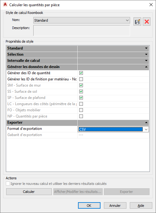 Lance le processus d'exportation. L'exportation au format CSV génère un fichier pour chaque catégorie de quantités par pièce. Chaque fichier est précédé du nom du dessin et du nom du type de calcul Roombook.