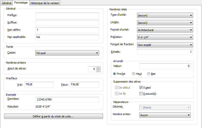 Chaque format de données de propriété contient des paramètres distincts pour la mise en forme de tous les types de données suivants :
