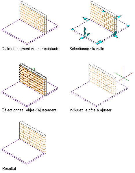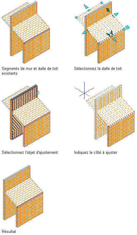 L'objet d'ajustement lui-même ne doit pas obligatoirement croiser la dalle ou la dalle de toit, du moment qu'il produit une intersection dans le système de coordonnées utilisateur en cours (SCU). Néanmoins, le plan d'ajustement doit croiser la ligne de périmètre de la dalle ou de la dalle de toit : vous ne pouvez pas ajuster la saillie uniquement.