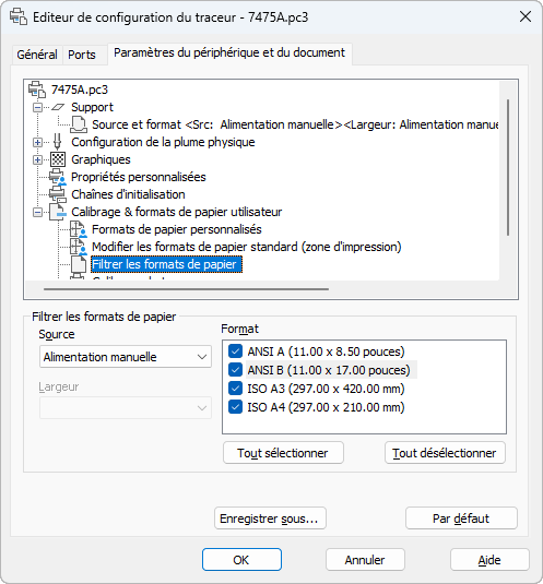 Ajuste la zone d'impression des formats de papier standard en fonction des possibilités de l'imprimante. (Vous ne pouvez pas créer des formats de papier personnalisés pour les imprimantes système Windows à l'aide de l'éditeur de configuration du traceur.)