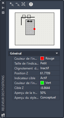 Par défaut, cette fenêtre s'affiche automatiquement lors d'une visite virtuelle ou d'un survol en 3D. Modifiez les paramètres ou faites glisser les indicateurs dans cette fenêtre pour repositionner la fenêtre dans la zone de dessin.