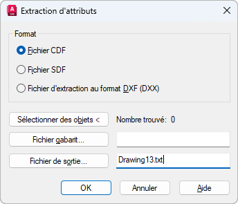 Spécifie le format de fichier des informations d'attribut, les objets à partir desquels vous voulez extraire des informations, ainsi que les noms du gabarit et du fichier de sortie.