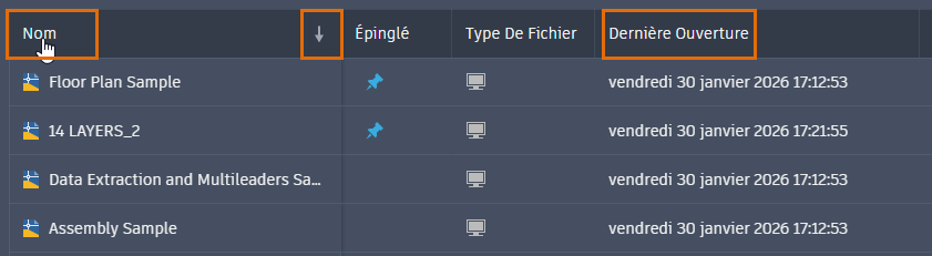 - Vue sous forme de liste : cliquez sur l'en-tête de colonne Nom ou Dernière ouverture pour trier les documents. Cliquez sur la flèche verticale située à droite de la méthode de tri pour inverser l'ordre de tri.