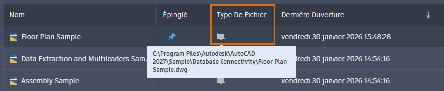 - Dans l'une ou l'autre vue, placez le curseur sur l'icône Type de fichier pour afficher le chemin source du fichier.