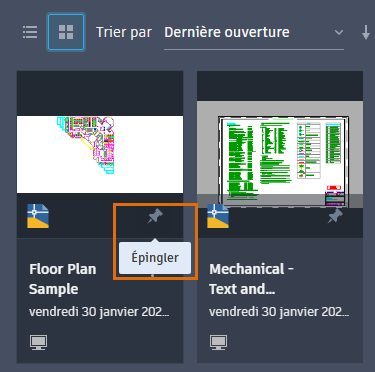 - Vue sous forme de grille : déplacez le curseur vers le coin supérieur gauche de la miniature du fichier jusqu'à ce que l'icône de punaise s'affiche. Cliquez pour épingler le fichier.