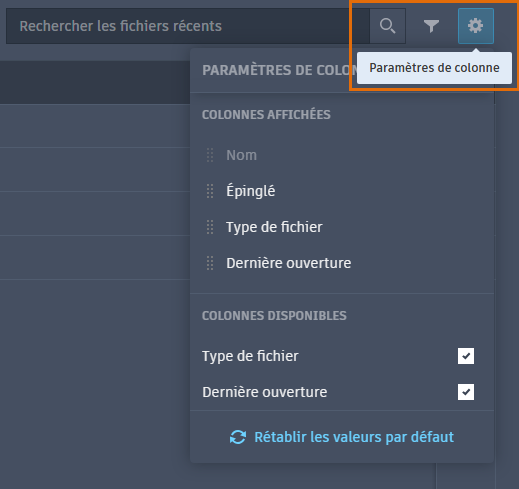 Dans la vue sous forme de liste, l'icône des paramètres de colonnes (engrenage) située dans le coin supérieur droit permet de personnaliser la vue en activant ou désactivant les colonnes affichées et leur ordre d'affichage. Les colonnes Nom et Épinglé sont toujours affichées en tant que première et dernière colonnes, respectivement.