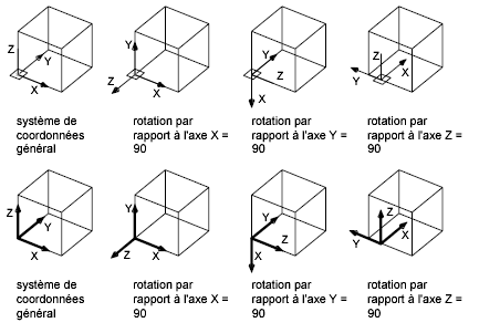 Vous pouvez définir tout SCU en spécifiant une origine et une ou plusieurs rotations autour de l'axe X, Y ou Z.