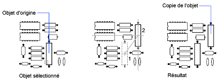 Copiez un objet en utilisant la distance et la direction spécifiées par un point de base suivi d'un second point. Dans cet exemple, vous devez copier le bloc représentant un composant électronique. Sélectionnez l'objet original à copier. Spécifiez le point de base pour le déplacement (1) et choisissez un second point (2). L'objet est copié à la distance et dans la direction du point 1 vers le point 2.