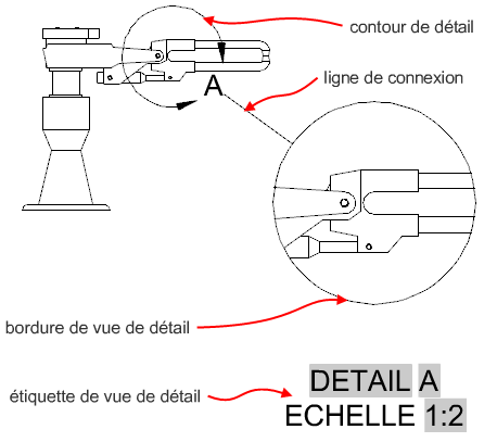 Une vue de détail de la documentation du modèle est une vue projetée générée à partir d'une vue de dessin existante. Une vue de détail affiche une partie spécifique de la vue de dessin (d'où elle provient), à une plus grande échelle.