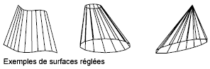 Le maillage à surface réglée est constitué d'une surface maillée 2 par N. SURFREGL place la moitié des sommets de maillage à intervalles réguliers le long d'une courbe de définition et l'autre moitié le long de l'autre courbe, également à intervalles réguliers. Le nombre d'intervalles est spécifié par la variable système SURFTAB1. Il est identique pour chaque courbe ; par conséquent, la distance entre les sommets le long des deux courbes varie si ces courbes n'ont pas la même longueur.