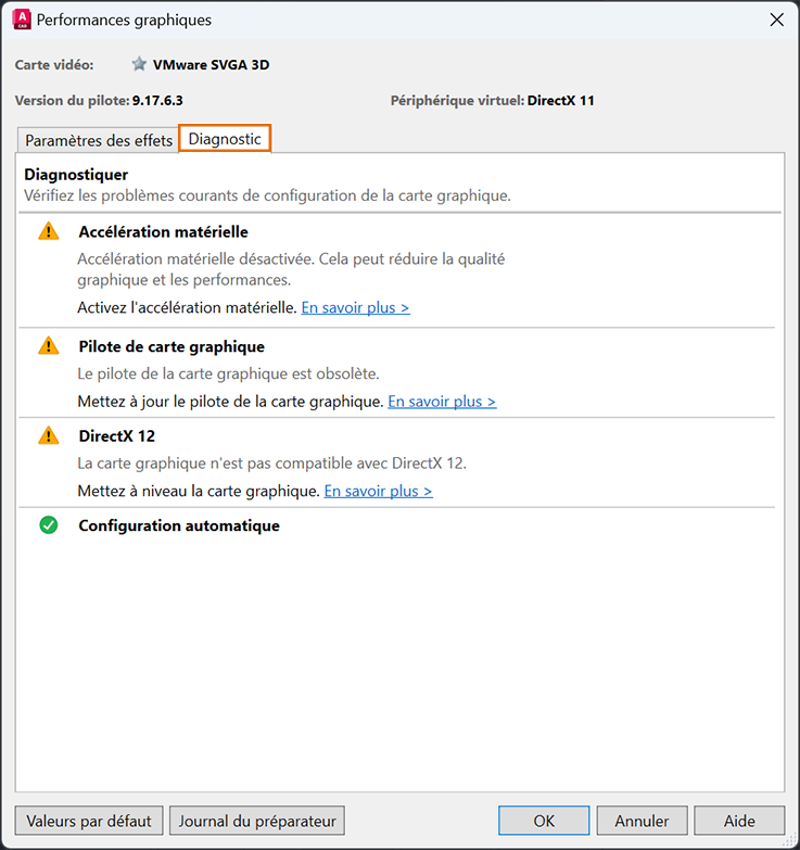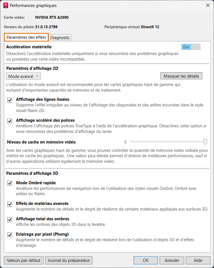 Cette boîte de dialogue contrôle l'accélération matérielle, modifie les paramètres d'affichage 2D et 3D et diagnostique les problèmes courants de configuration de la carte graphique.