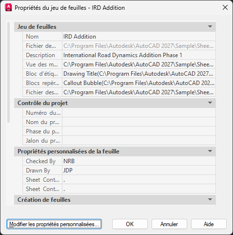 Ces informations incluent le chemin et le nom du fichier de données du jeu de feuilles (DST), le chemin des dossiers contenant les fichiers dessin associés au jeu de feuilles, ainsi que toutes les propriétés personnalisées associées au jeu de feuilles.