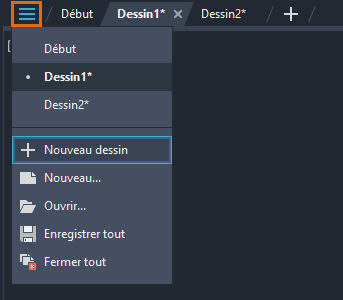 Utilisez le menu de l'onglet Fichier pour afficher la liste des dessins ouverts, passer d'un dessin à un autre, enregistrer tous les dessins, fermer tous les dessins, etc.