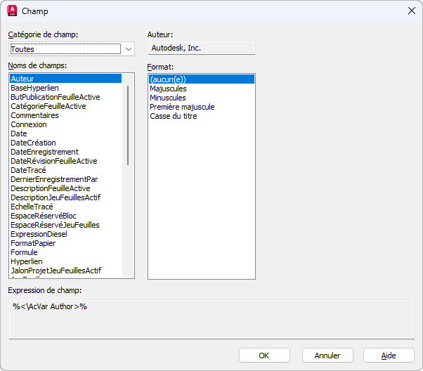 Le libellé de cette option varie selon le nom de champ. Ainsi, par exemple, si Nom de fichier est sélectionné dans la liste Noms de champs, le libellé est Nom de fichier et la valeur est le nom du fichier dessin courant. Les champs d'objet ont pour libellé Propriété. Exception : si un champ de date est sélectionné, le format de date sélectionné s'affiche (M/j/aaaa, par exemple).