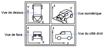 L'orientation d'affichage de la vue orthogonale spécifiée est basée sur la variable système UCSBASE, définie sur le système de coordonnées général par défaut. Lorsque l'une des vues orthogonales est restaurée, le programme effectue un zoom jusqu'aux limites de la fenêtre courante.