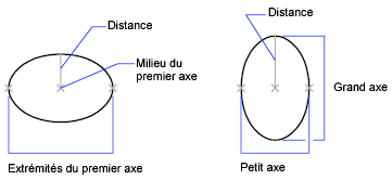 L'illustration ci-dessous montre deux ellipses créées en spécifiant l'axe et la distance. Le troisième point spécifie seulement une distance et ne désigne pas nécessairement l'extrémité de l'axe.