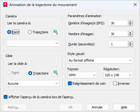 Spécifie les paramètres applicables à l'animation de la trajectoire de mouvement et crée un fichier d'animation.