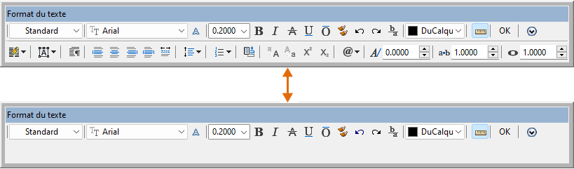 Gère l'affichage de la barre d'outils Format du texte. Cette option définit la variable système MTEXTTOOLBAR. (Indisponible pour le texte sur une seule ligne.)