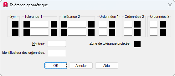 Affiche le symbole géométrique caractéristique sélectionné dans la boîte de dialogue Symbole. Celle-ci s'affiche pour vous permettre de sélectionner l'une des boîtes de texte Sym.