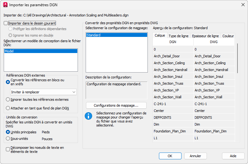 Standard est la configuration de mappage par défaut qui extrait des données du dessin exporté et applique un mappage automatique aux calques DGN, types de ligne, épaisseurs de ligne et couleurs, tels qu'ils apparaissent dans l'aperçu de mappage.